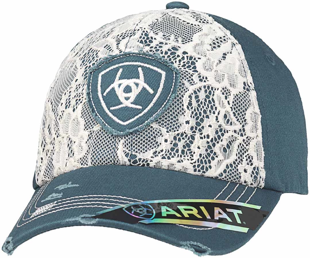 You will love this comfortable and lightweight Ariat ladies cap by M&F Western Products. This cap features a distressed bill and a Velcro back closure, lace front and an Ariat shield logo patch that is embroidered on the crown.
