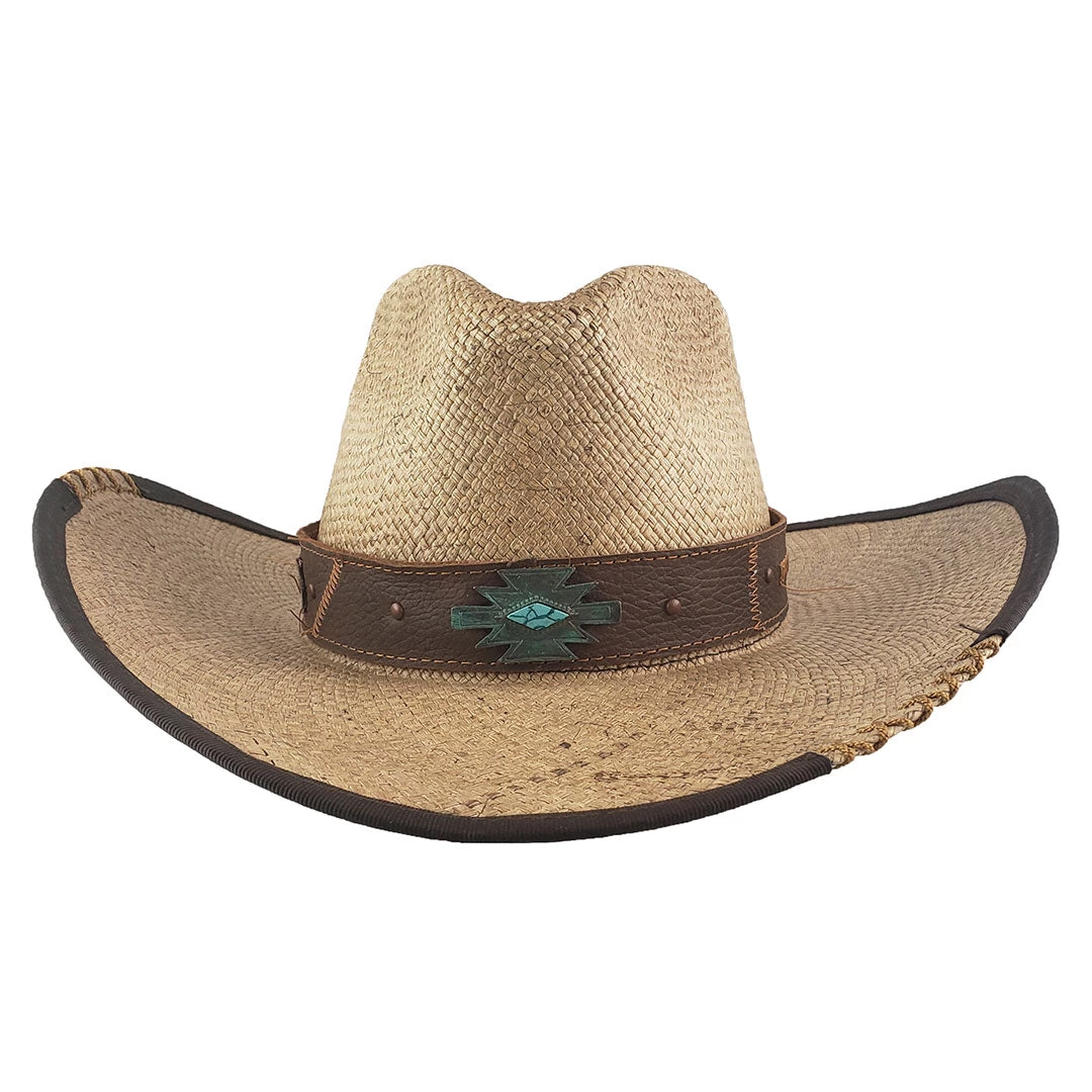 From Bullhide Hats, No Rules apply when and where you decide to wear this genuine panama straw hat. This hat features 3 3/4″ shapeable brim with binding and cross stitch detail, and a leather hatband with distressed aztec leather detail and turquoise stone.