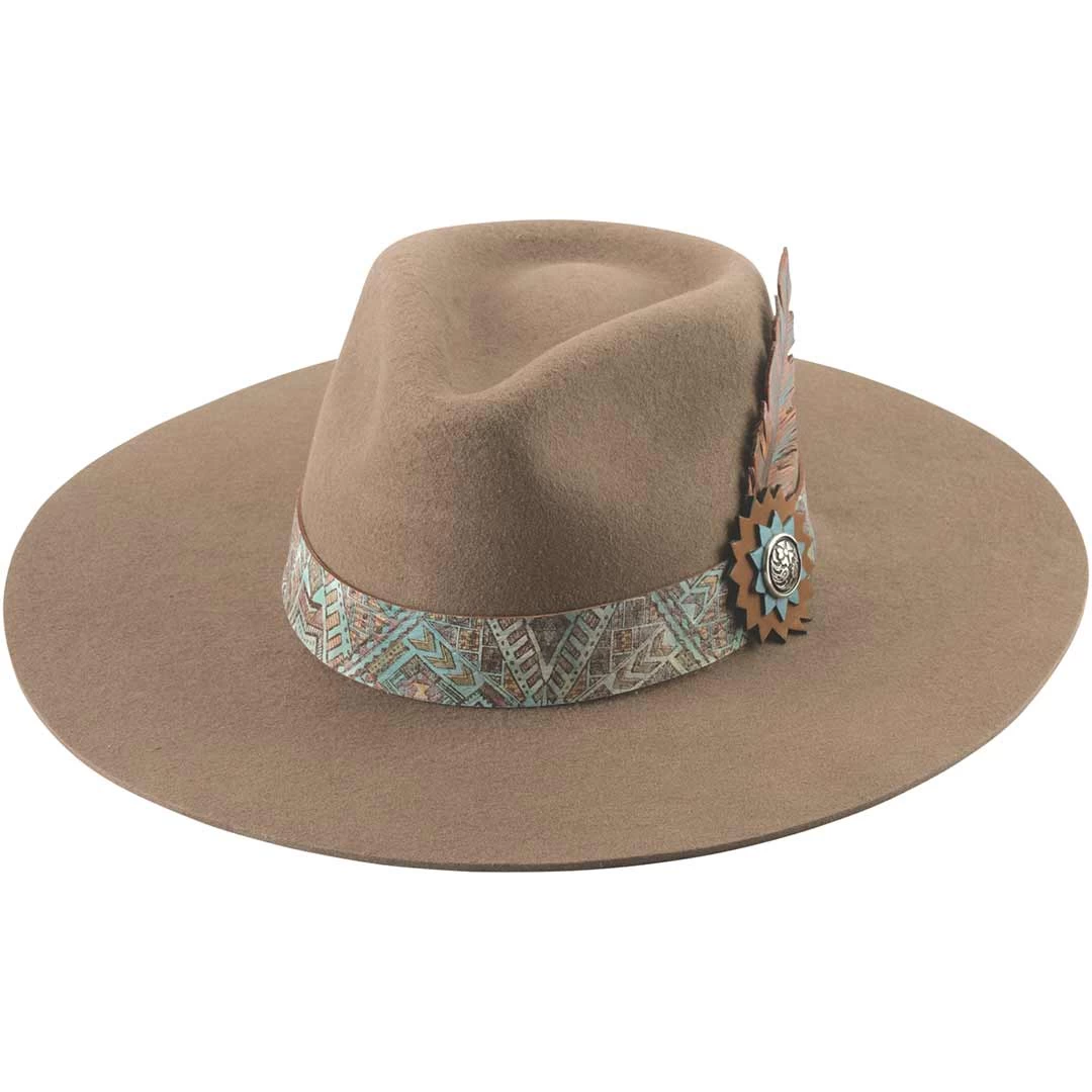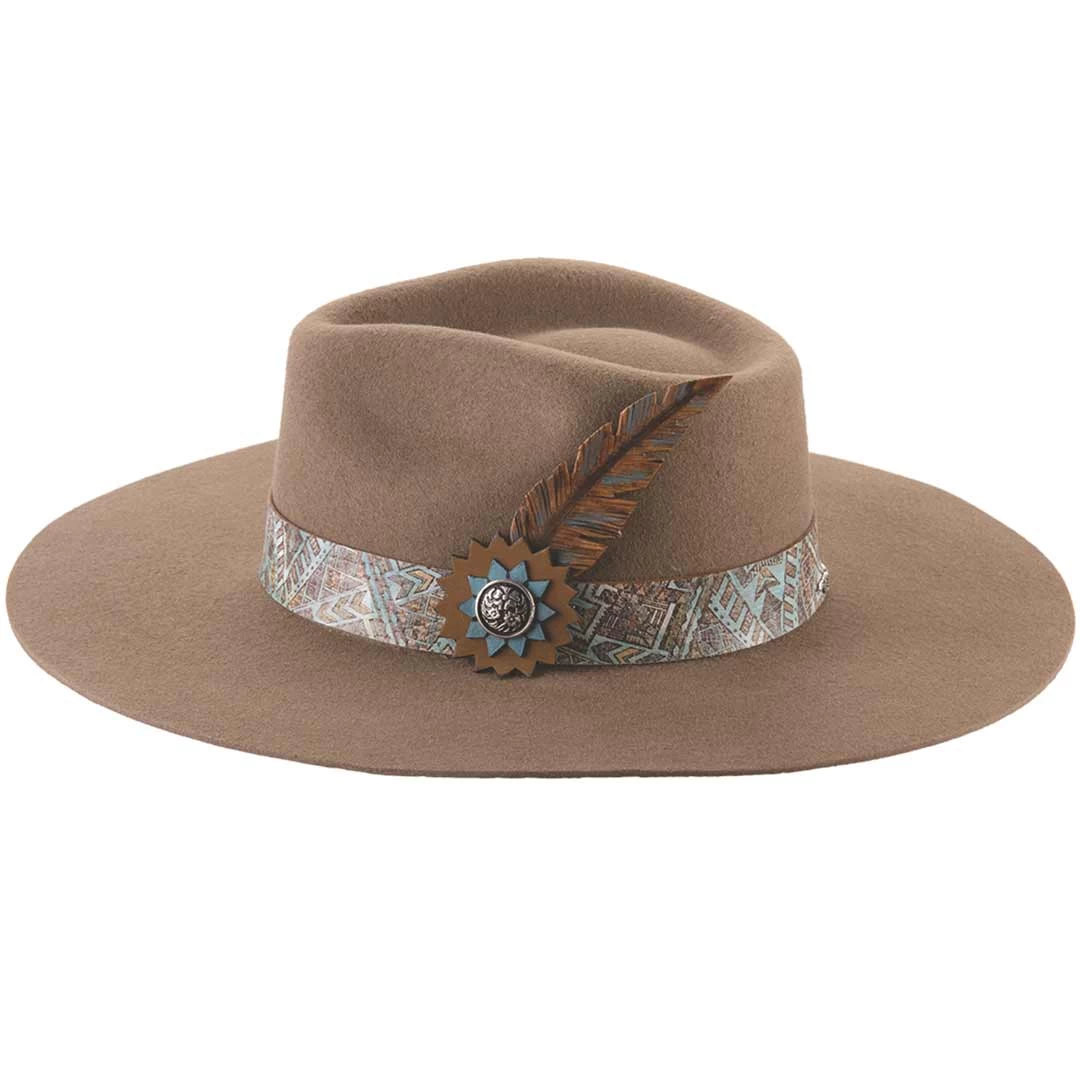 The Tamarack is a straw hat by Bullhide. The Tamarack is part of Bullhides Western Couture Collection. It is a sand pinch front felt with a Southwestern print hat band with leather feather and concho accent.