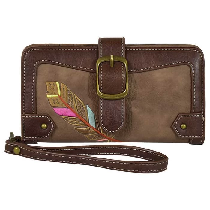From Catchfly, this women’s wallet is done in two tone brown and features feather embroidery and faux buckle tab closure. It has one ID window, 4 open slot pockets, 11 card slots and one zip coin pocket.
