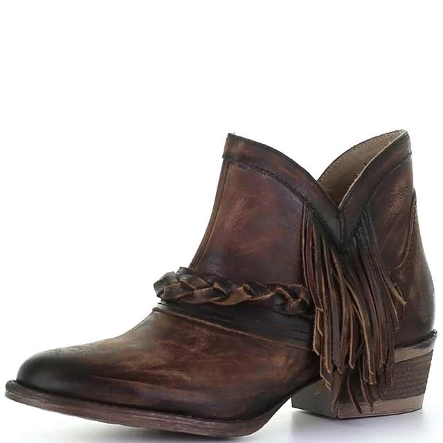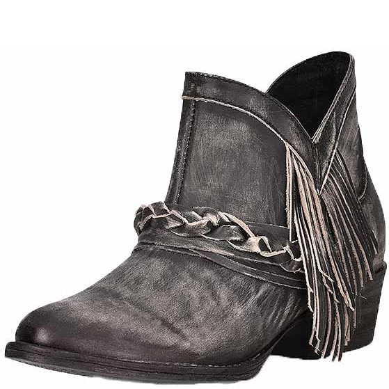 Bring out your city girl in these round toe ankle boots from Circle G’s urban collection. They feature a 5″ shaft height that go great with skinny jeans, 1 1/2″ fashion heel, a zipper and even some fringe just to keep it a little country. The perfect pair of boots for a night on the town.