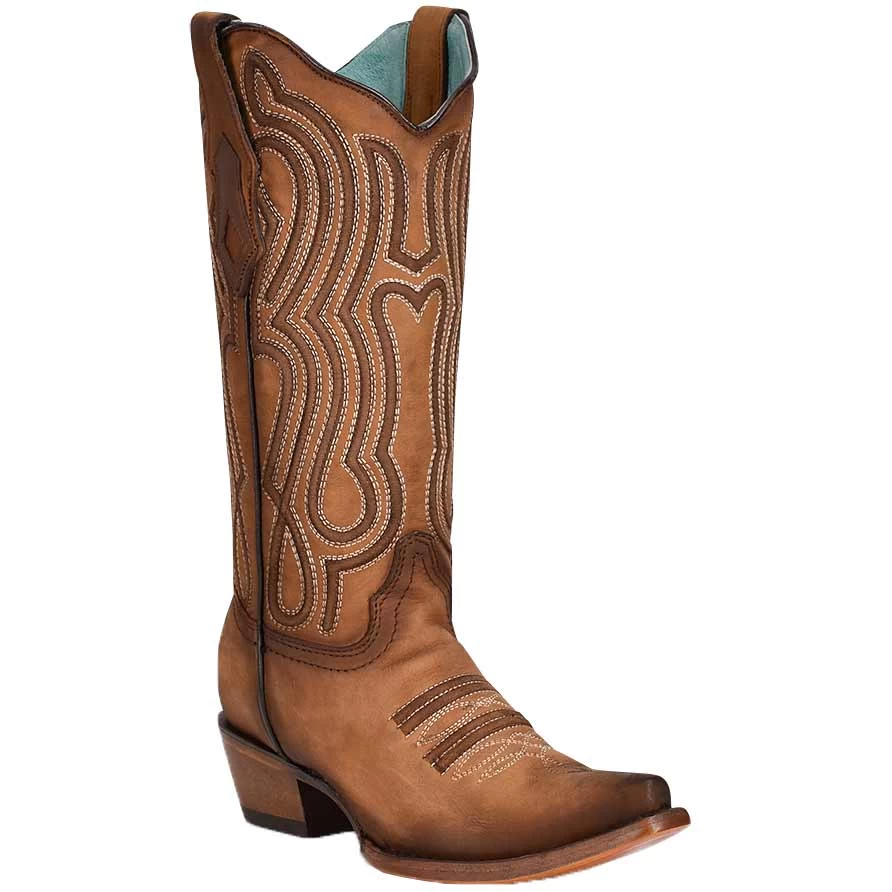 Style meets comfort with this striking pair of cowgirl boots from Corral Boot Co. They feature a brown leather foot and upper, bold embroidery and leather design, snip toe and cowboy heel.