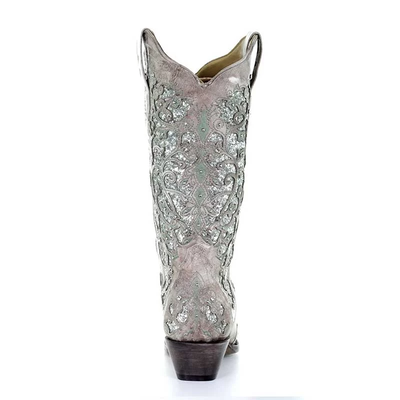 From Corral Boots’ wedding special line, the Martina Green is an alluring pair of boots perfect for parties, weddings or any occasion where you want to standout. Embellished with glitter inlay and crystals, and a classic cowboy heel, this boot is sure to make a statement.