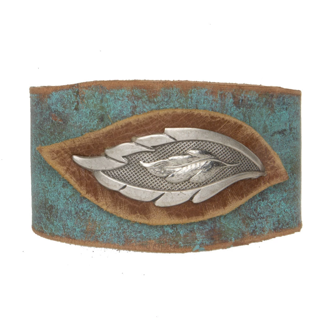 From AndWest’s Cowgirl Confetti collection, this hand distressed turquoise leather cuff features a double layered silver leaf on a hand cut tan leather leaf. Add some color and a little boho to your style with this beautifully simple cuff.