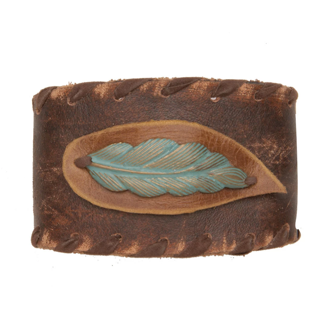 This brown leather cuff with hand stitched edges feature a turquoise metal leaf layered on top of a natural colored leather cut out. This beautiful cuff from Cowgirl Confetti by AndWest will look great with your causal concert attire.