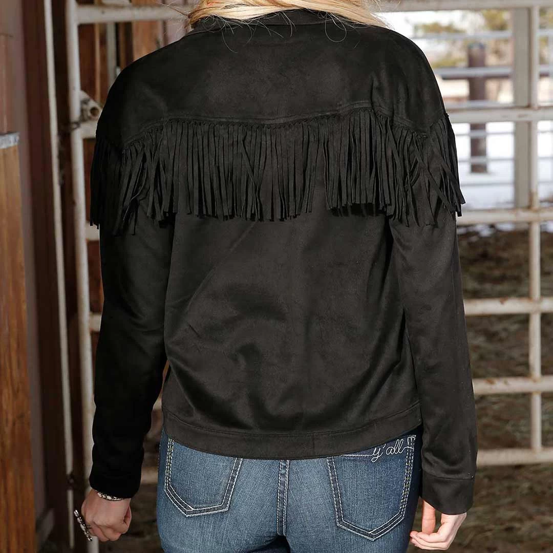 For the coolest look day or night, choose this edgy black polyester faux suede trucker jacket crafted by Cruel Denim. Adorned with cowgirl-favourite fringe detail, this chic jacket brings your standard denim and boots outfit to a whole other level.