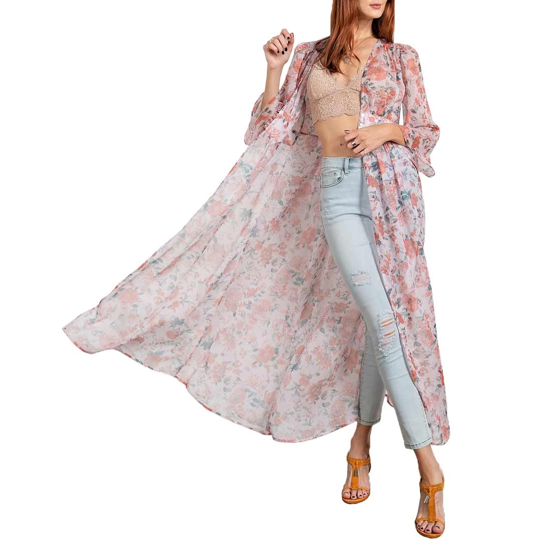 This sweet and stylish duster kimono from Easel is done in a sheer floral print material and features long wide sleeves and a button closure empire waist. With the duster length and light as air fabric this piece is perfect for layer over your favourite summer dress or jeans and a tank top.
