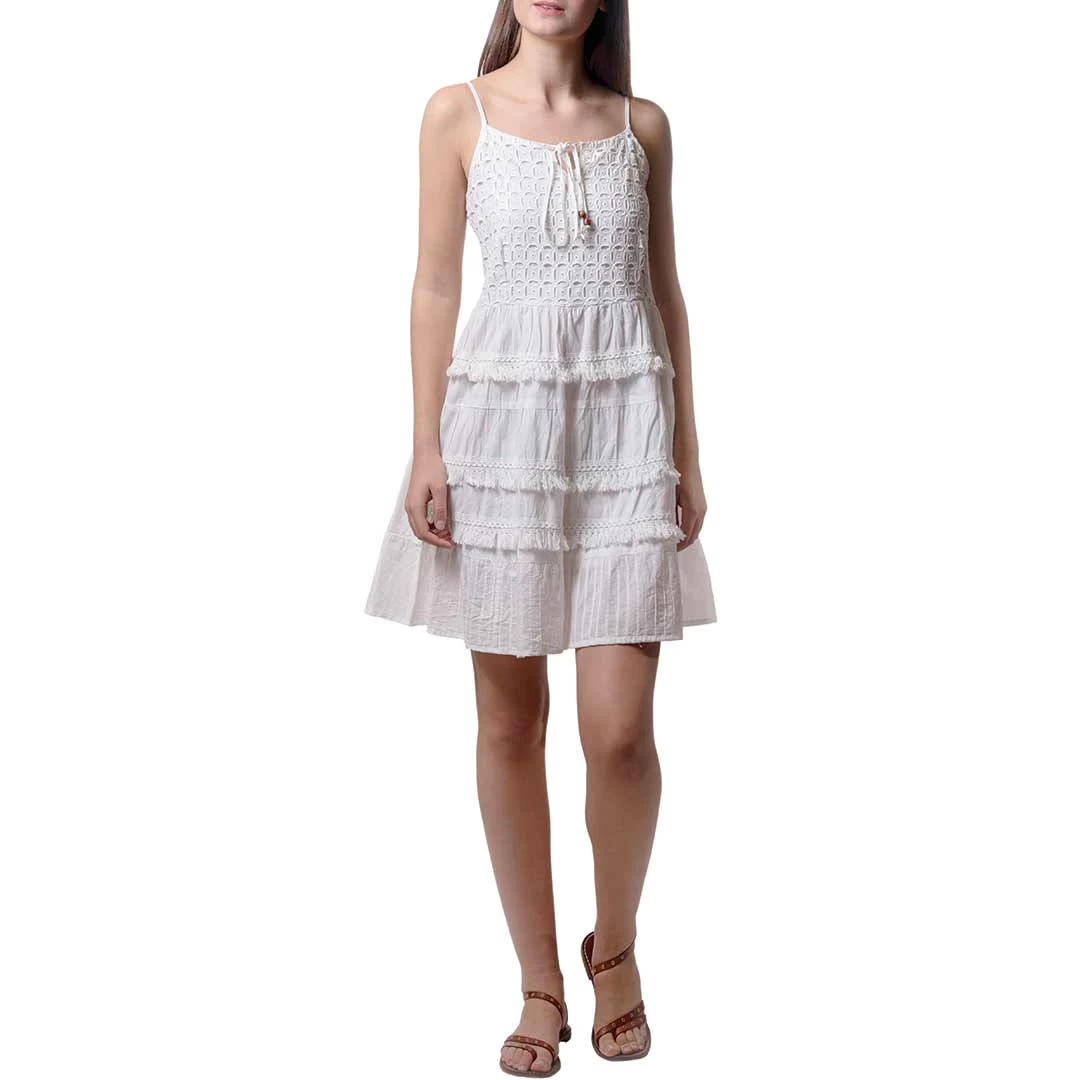 This eyelet dress by En/Kay is something everyone should have in their closet. It features adjustable spaghetti straps, an eyelet bodice, a tie-up straight neckline and a tiered fringe skirt.