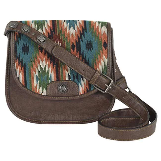 This chic women’s saddle bag from Justin will add some western style to your wardrobe. It features Aztec print jacquard fabric and antique silver conchos. It has one interior compartment, one zipper pocket, a magnetic snap closure and one exterior slip pocket.