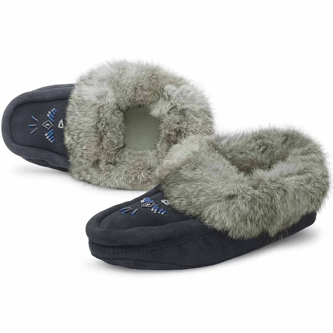 These women’s fur trimmed moccasins will keep your feet cozy and warm. The moccasins feature rabbit fur trim, beaded design, and padded soles.