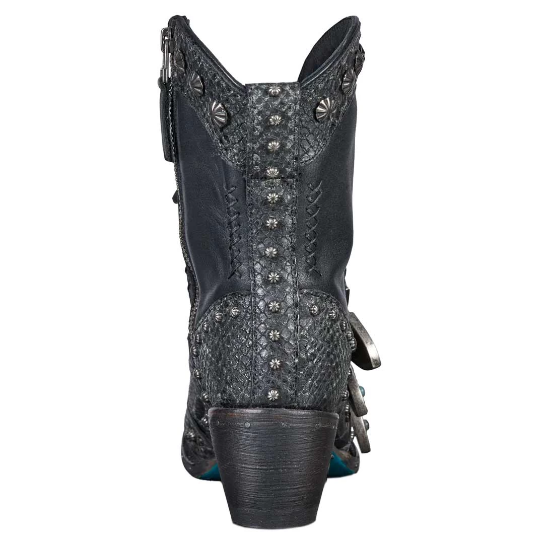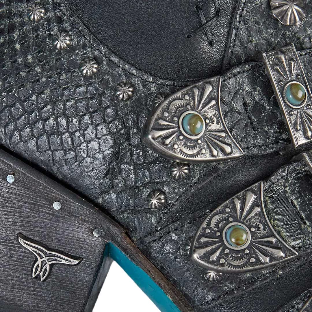 Step out boldly in variegated exotic leather, old pawn inspired hardware, and a functional corset on this ankle boot baddie. An elevated heel to accentuate your best features and bring confidence to your step.