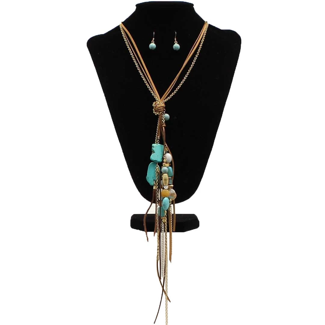 Show off your western fashion sense with this necklace set by M&F Western Products. The necklace has layered chain and leather tied in a knot with dangling turquoise stones a mixed beads. French hook turquoise bead earrings complete this great set.