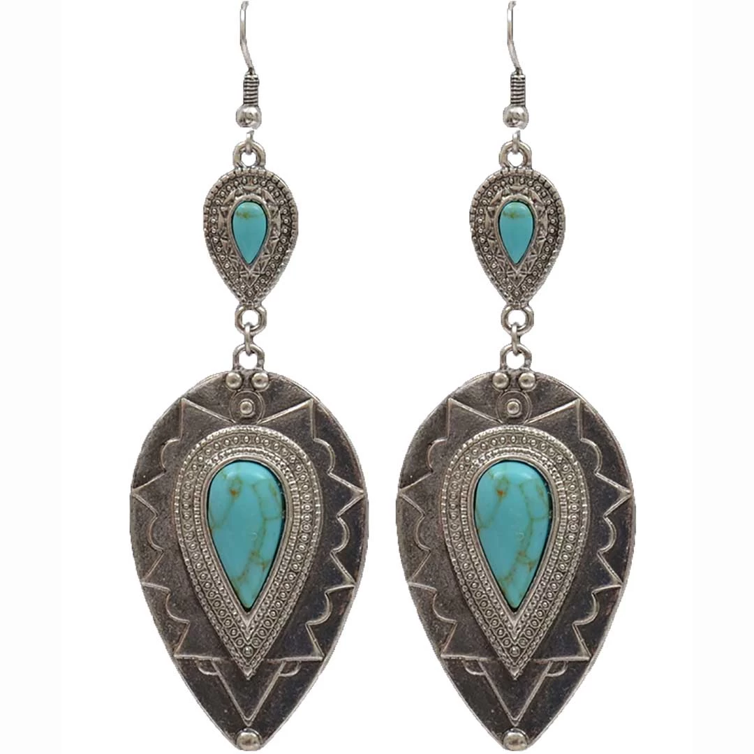 These beautiful earrings are by M&F Western Products. They feature turquoise teardrop stones in an antique silver toned setting.