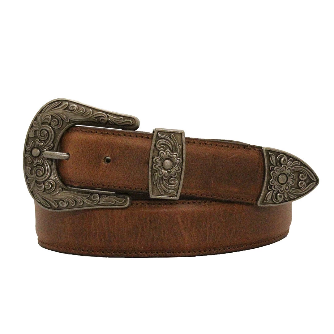 From MF Leather, this leather belt is made with a soft hand to the 100% genuine leather construction. The belt features sewn closures and a detailed western scroll work buckle in an antiqued silver finish.