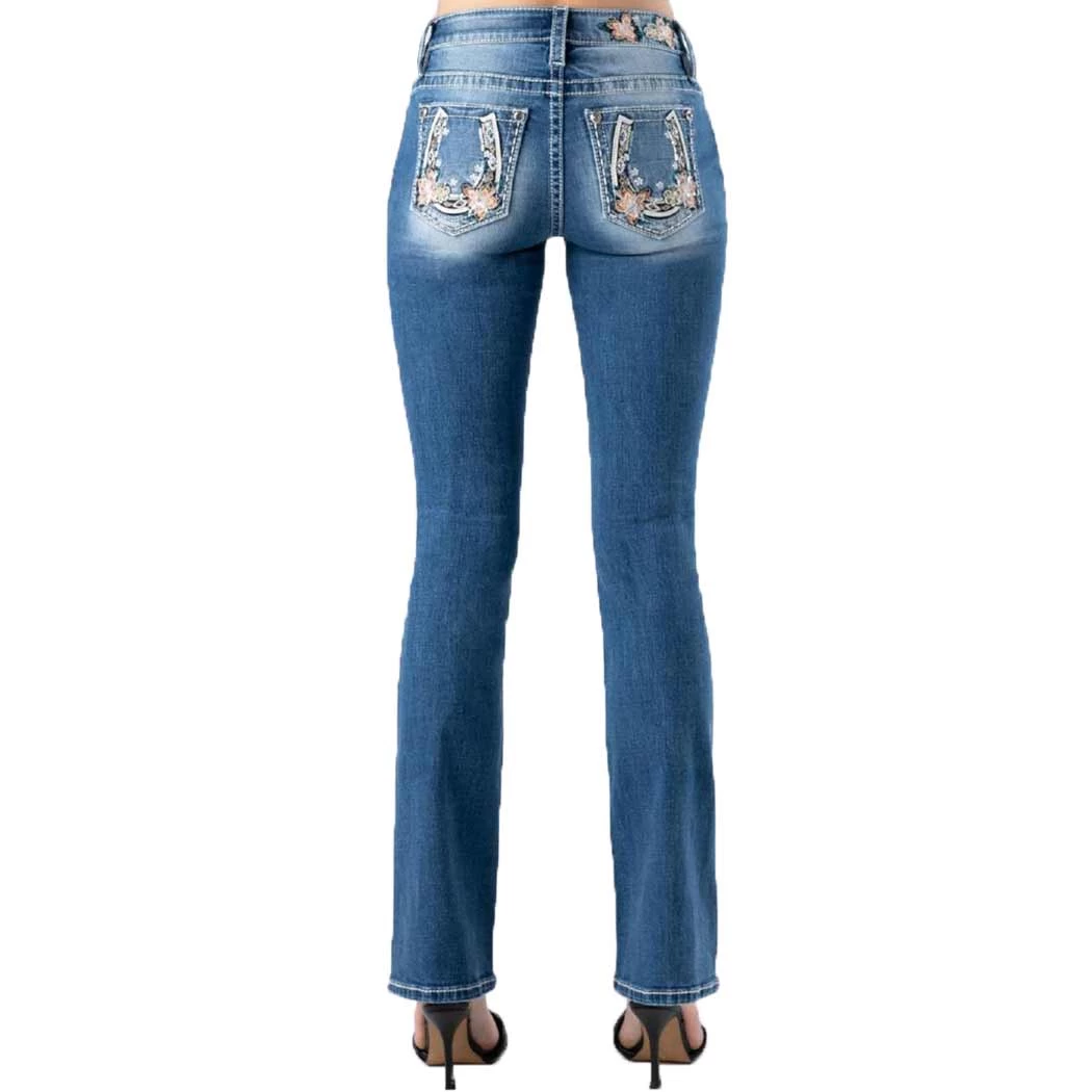 The Floral Horseshoe design from Miss Me is a mid-rise, light medium wash bootcut jean. Back pockets feature embroidered floral horseshoe with leather outline, sequins, and stud detailing. Flower brand patch features multicoloured embroidery and stitch work.