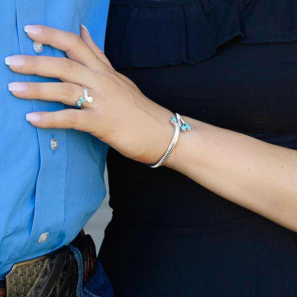 Some say ‘you can never go home’, but we disagree, we believe that no matter your path you’ll find your way home again. The All Roads Lead Home Bracelet is a stunning cuff with a pointed design that wraps around your wrist. At the top of the bracelet, the piece moves upward and ends with an almond-shaped turquoise stone. Similarly, on the other side, the silver-tone cuff diverges downward toward two almond-shaped turquoise stones to finish the design. One size fits most. Stone colour will vary.