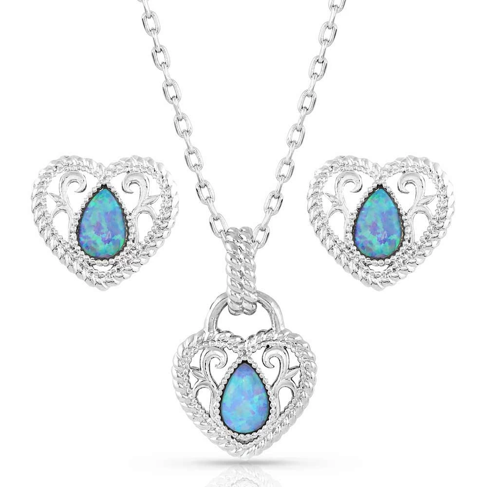 Small, quaint, and full of glee! Montana Silversmiths’ Gleeful Heart Silver Jewelry Set is youthful with shine and color. It has earrings with a matching necklace. The earrings hang from a hypoallergenic post-back wire that holds their small heart shape. The heart shape is silver-toned and filigree wire detailed with roping texture. Within the center of the heart, a teardrop opal stone is placed upside down. The necklace dangles from a 19″ chain holding the same heart shape with silver-toned rope textures and details. It’s an effortless look!