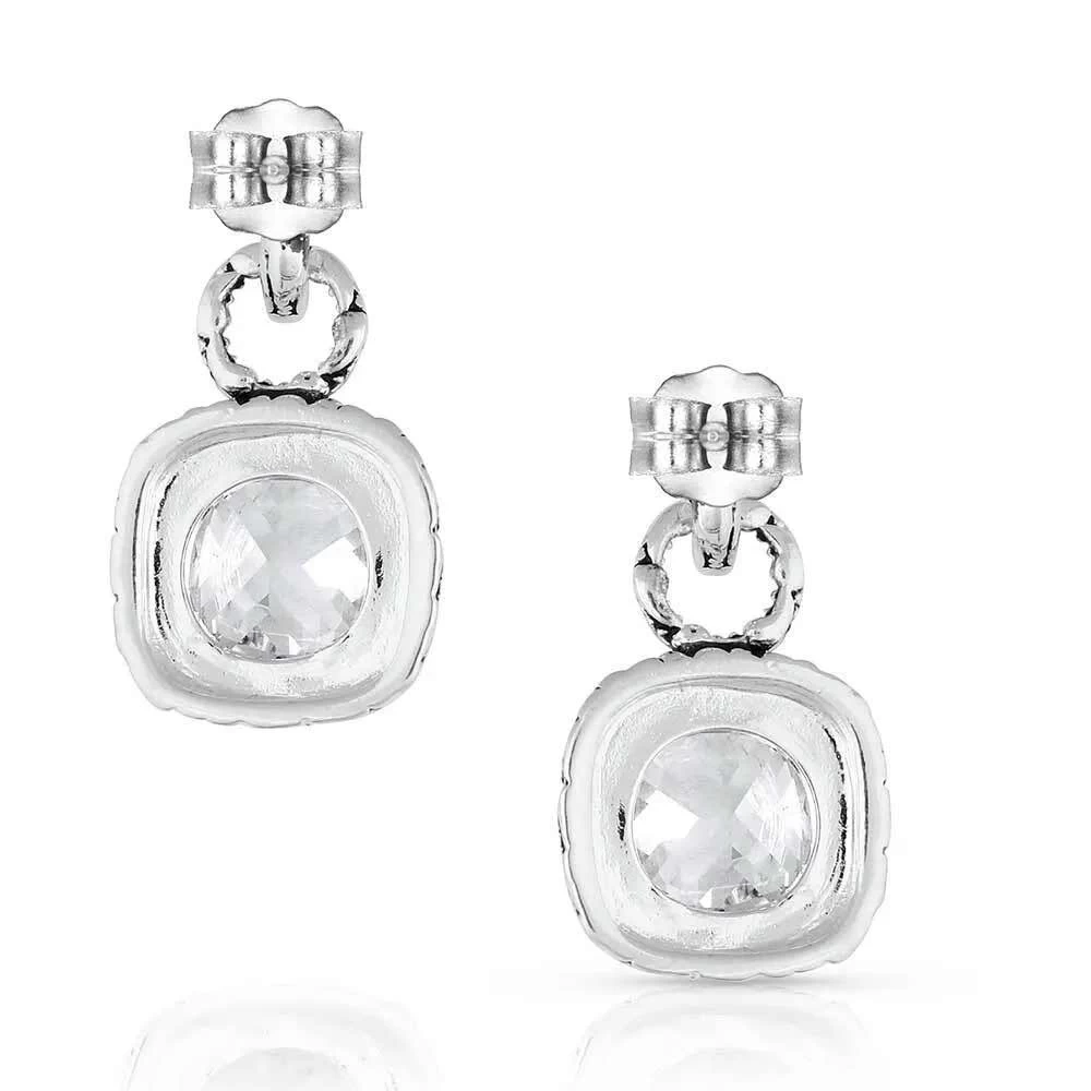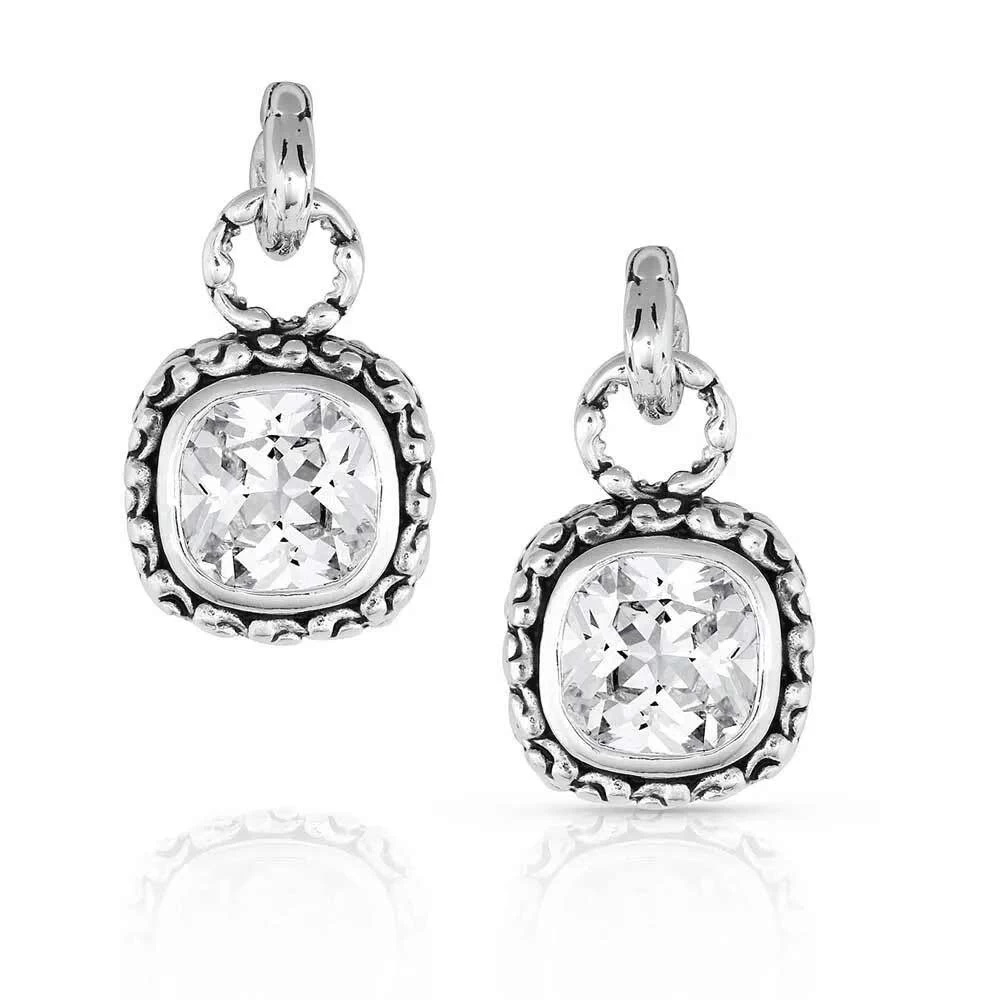Nothing brings us more joy than the Western Delight Crystal Earrings. The gorgeous earrings showcase a rounded square-shaped clear cubic zirconia crystal with a rope-like silver setting that secures the stone in the earring. The crystal is surrounded by an intricate etched design that continues up to loop around and attach to the hypoallergenic post.