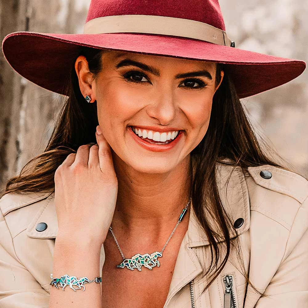 Montana Silversmiths iconic American Legends collection keeps growing, with the All the Pretty Horses Necklace. The necklace features three running horse silhouettes. Geometric pattern brings colour to the design. Dark red, bright turquoise, vivid navy, and deep blue coloured stones are all held together and laid with silver tones. Finishing the necklace is a silver-tone 21 inch chain with the addition of two pieces on either side featuring inlaid coloured stones. Montana Silversmiths Legacy Mark, a tribute to the importance and legacy embodied in a ranch brand, decorates the back.