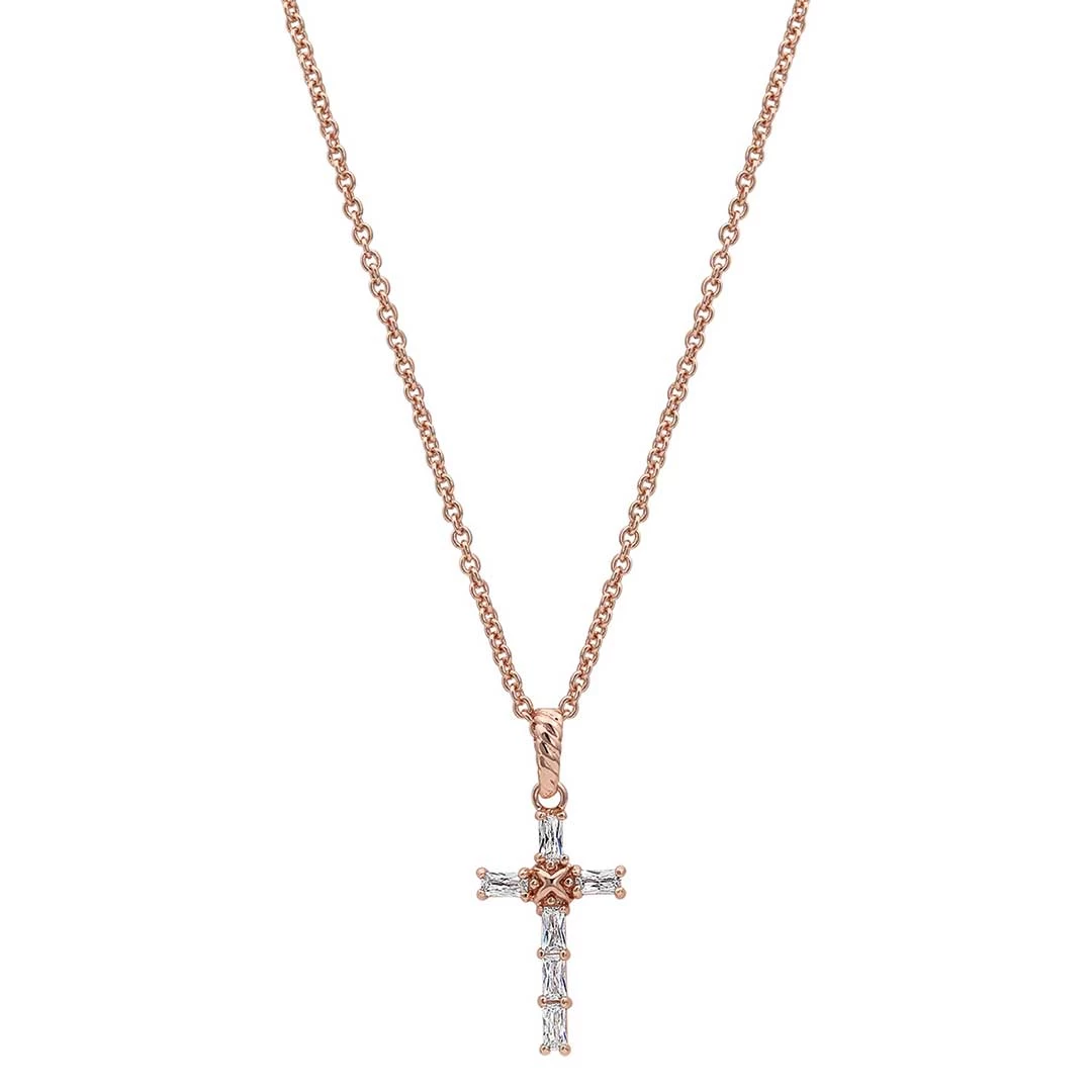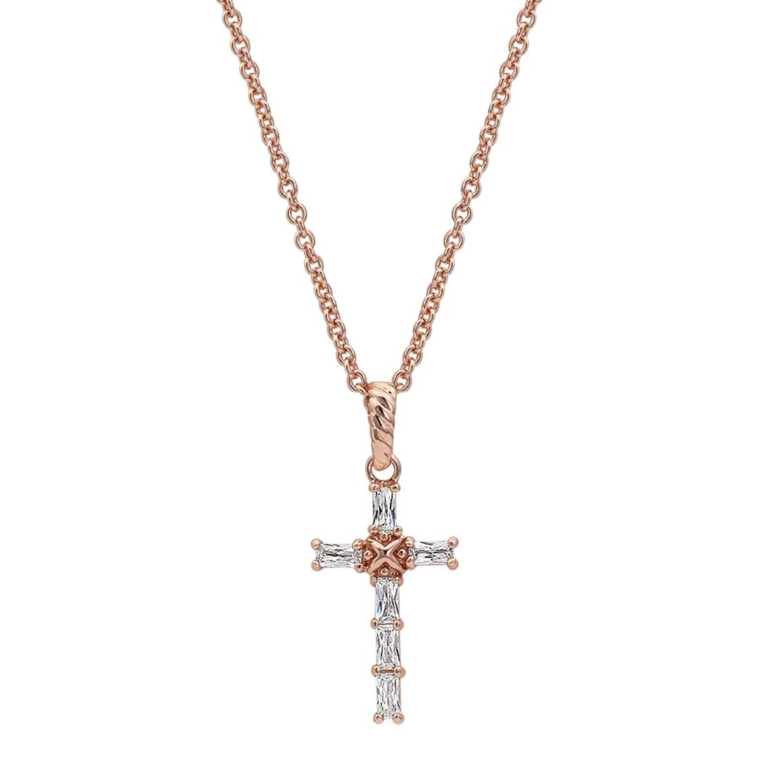 From Montana Silversmiths this brightly shining cross necklace with arms created from multiple clear baguette shaped stones seem to shine even more brightly in the vivid rose gold setting with a thin line design in the center giving the appearance the rose gold is wrapped around the center. Cross pendant hangs on a bright rose gold toned twisted rope bail on a princess length 19 inch chain.