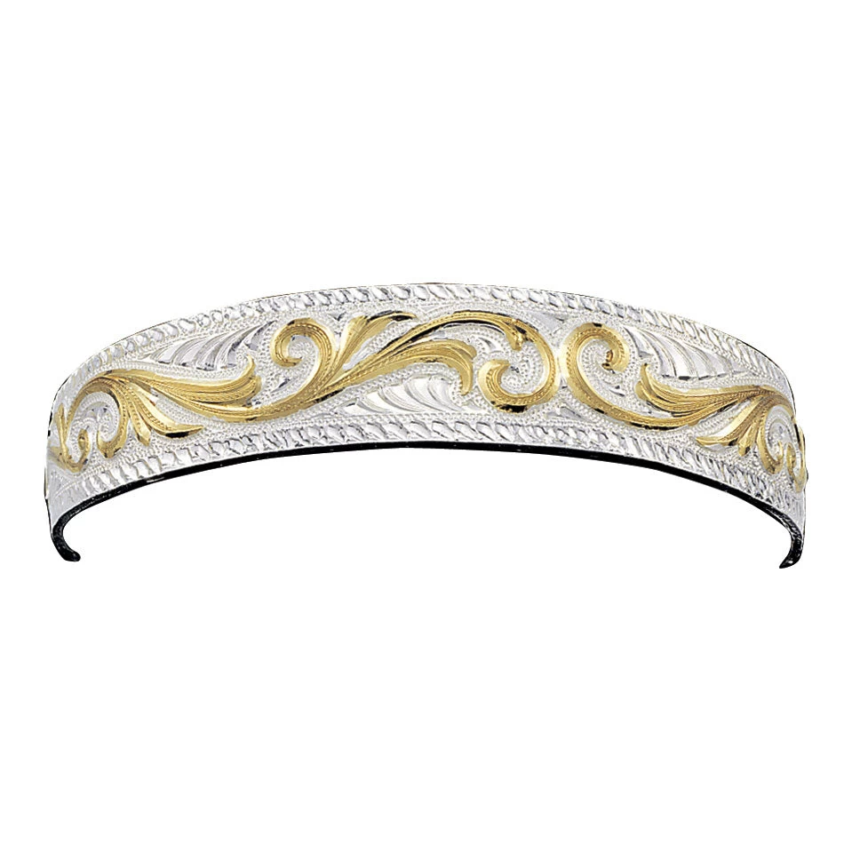 Beautiful scroll work in gold filigree sits atop bright cut western engraving on this slim cuff bracelet from Montana Silversmiths. Etched silver edges complete the bracelet’s clean cut and timeless appeal.