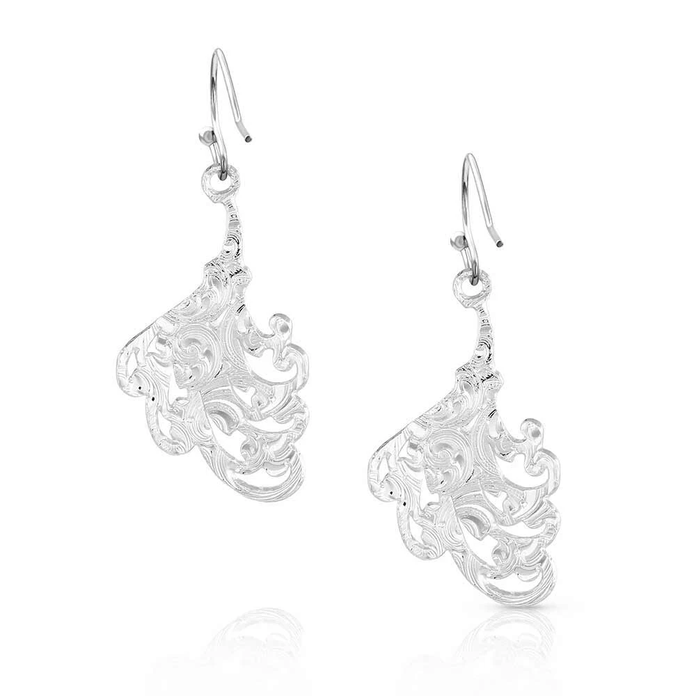 The romanticism of the old west radiates from the incredible Conestoga Duster Earrings. The silver artistry of Montana Silversmiths is on full display with these earrings. The silver-tone earrings are bright and sure to be stunning with any outfit. The earrings feature elegant bright-cut engraving with tendrils of sweeping open-cut filigree at the bottom of the earrings. The classic earrings dangle from a hypoallergenic French wire.