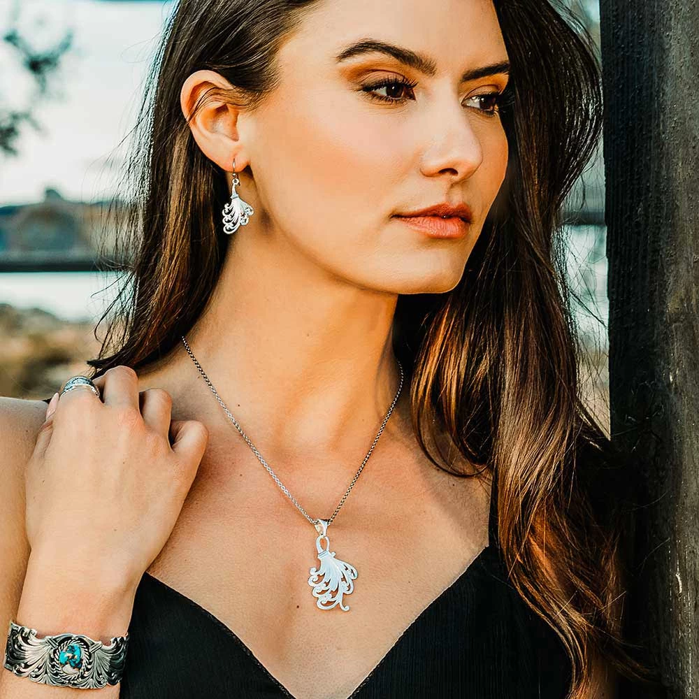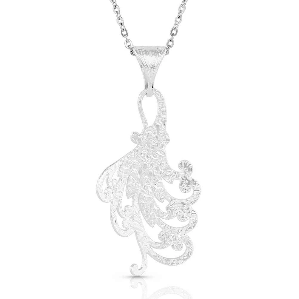 The beauty of the west shines through the Conestoga Duster Necklace in every way. The silver-tone necklace is bright and shining. The pendant features striking bright-cut engraving with tendrils of sweeping open-cut filigree towards the bottom of the pendant. The Montana Silversmiths silver artistry shines through the necklace and hangs from a 19 inch silver tone chain.