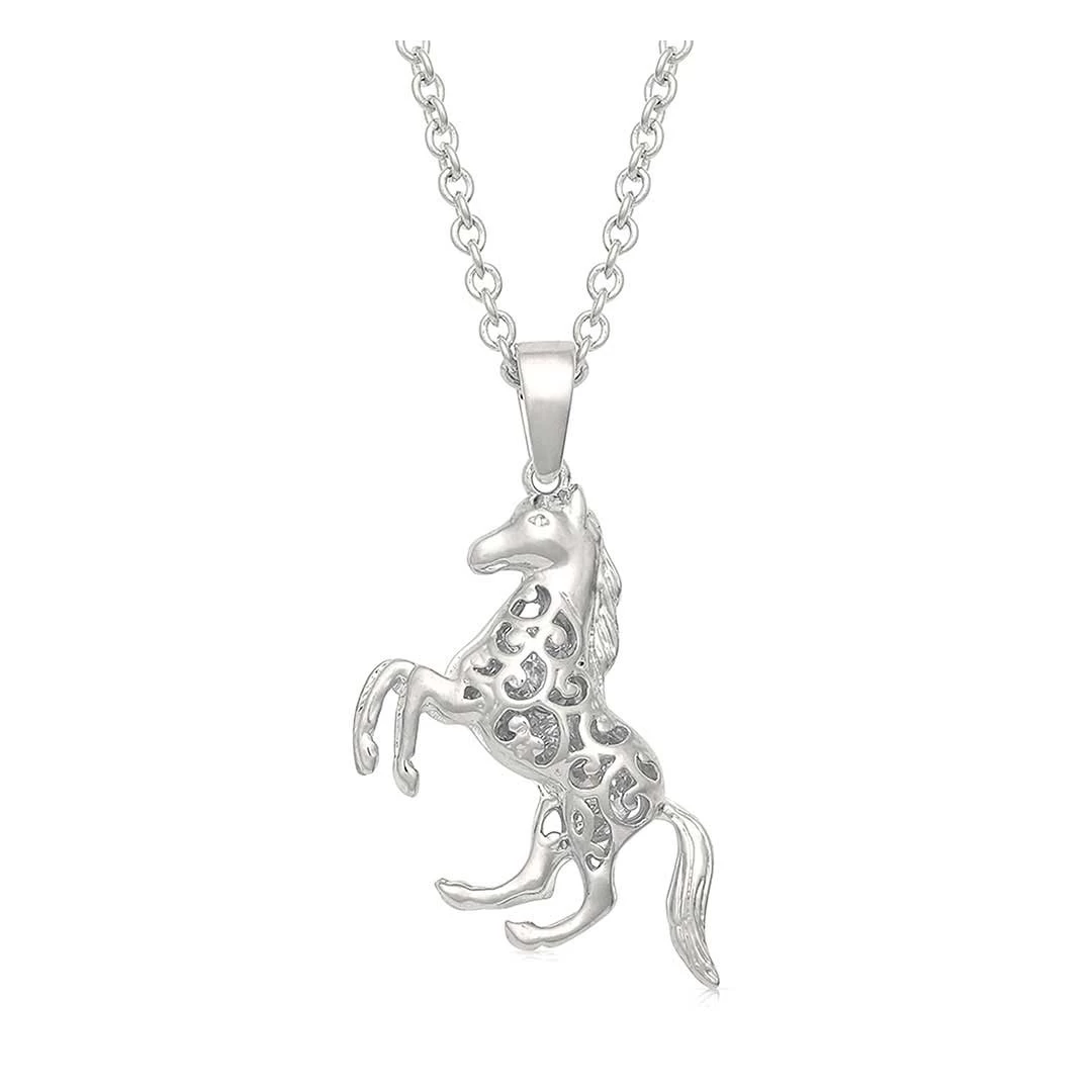 Montana Silversmiths’ Rearing Horse Charm Necklace is an intricate horse figure in a silver finish. It is shiny and has an even better twist – it has filigree cutouts throughout it’s body! It appears to be rearing up and back while it is suspended from it’s mane by a 19″ silver toned chain.