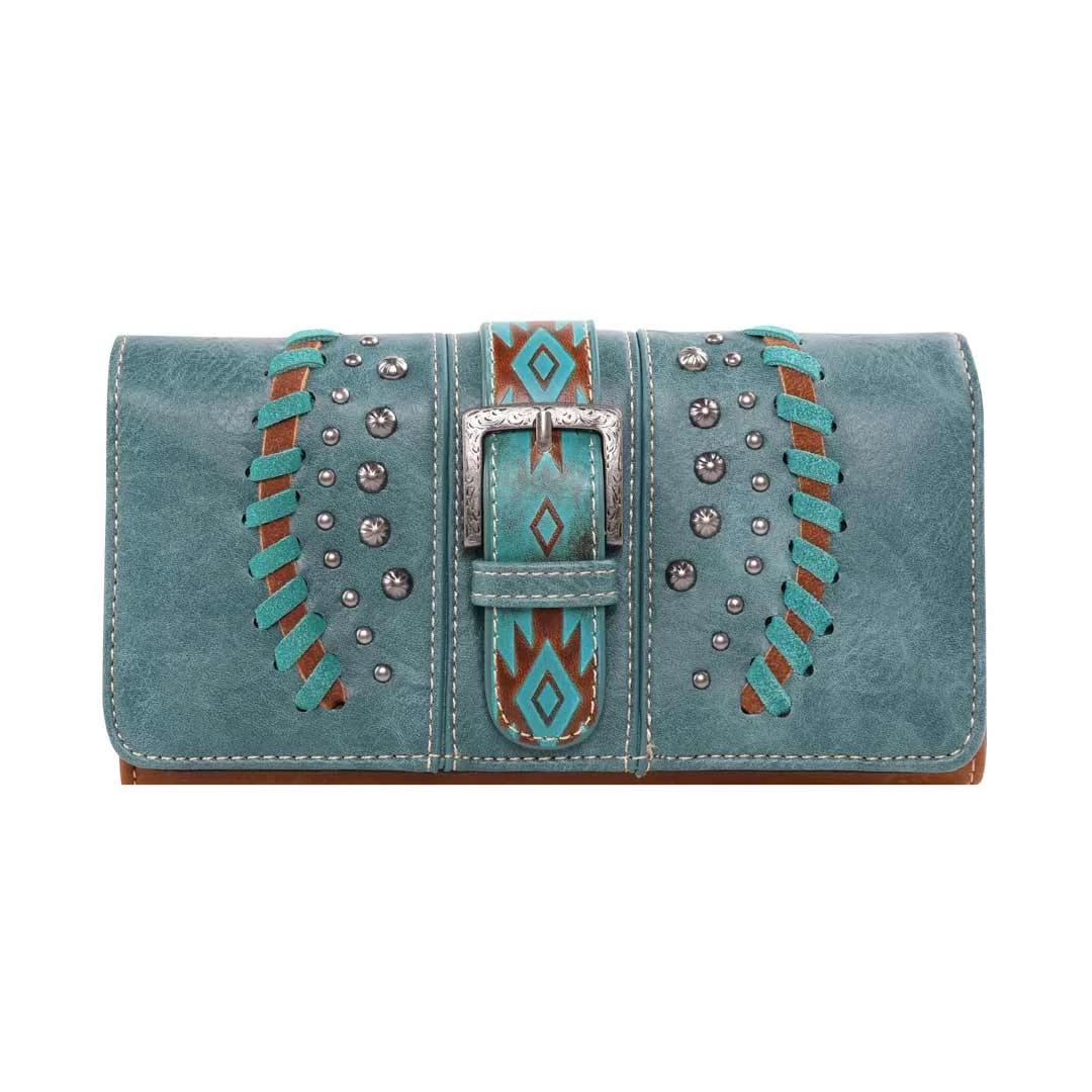 Made of PU leather, this wallet from Montana West has an embossed geometric Aztec pattern, an antique silver buckle on the front, whipstitch details, antique silver stud accents and a button closure. Inside of the wallet has 9 card slots, 1 ID holder,
