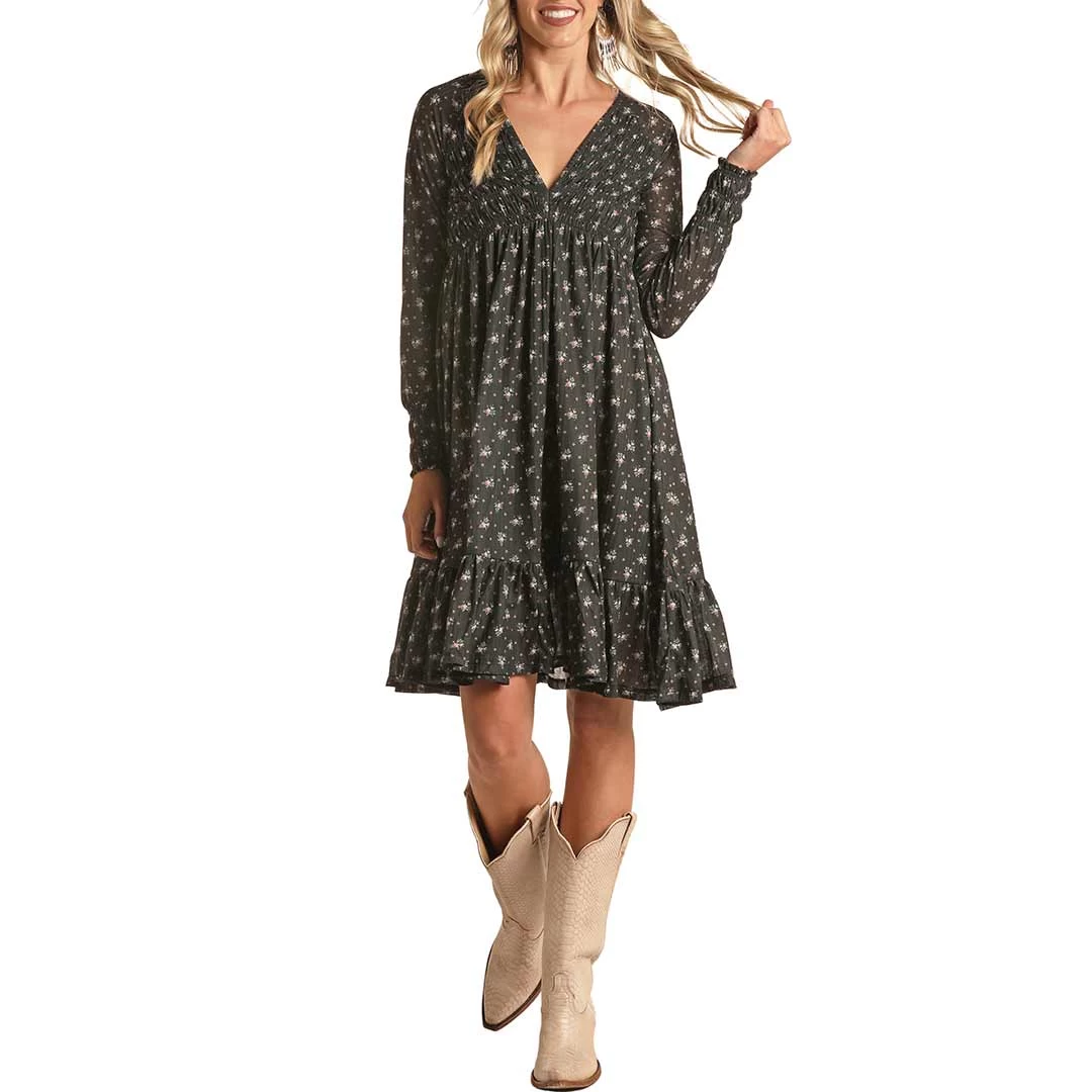 Pair with your favourite boot or shoe and you are ready to attend those summer parties in style. From Panhandle this swing dress has side long sleeves, V-neck, ruffle hem smocked yokes and cuffs and lands just above the knee.