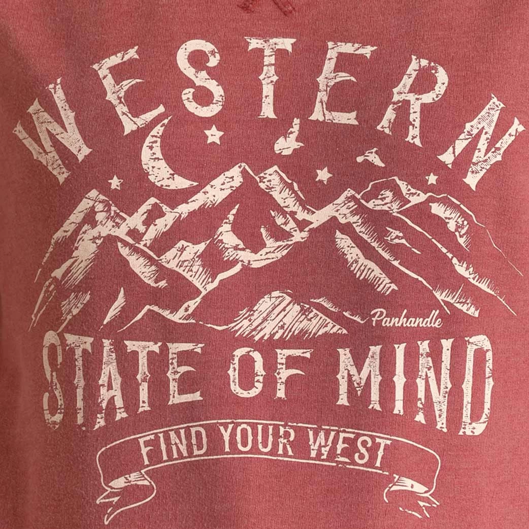 From Panhandle this sweatshirt features a wide neck, ribbed knit cuffs and hem and a “Western State of Mind” screen-print graphic.