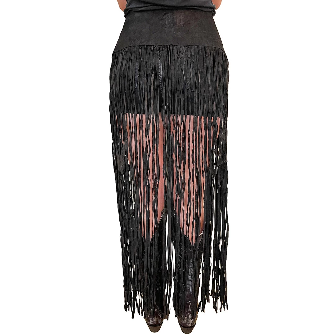 A long fringed belt with turquoise pie from Pat Dahnke. The turquoise pie makes a great focal on the long fringed curly black suede belt. A simple Velcro closure makes this a winner over pants, jeans, a dress, or shorts. It’s a very clean look.