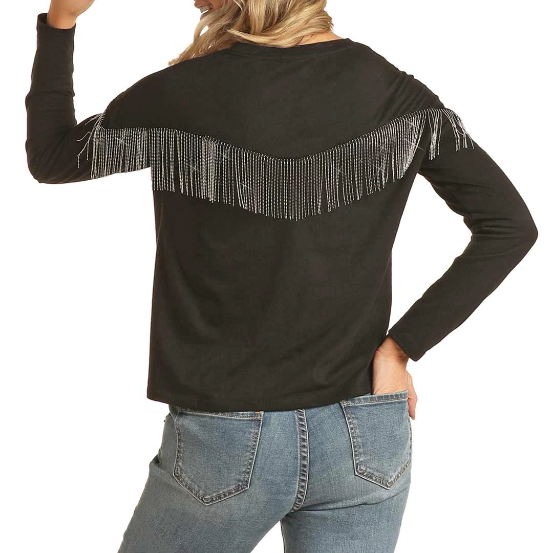 Taking the long sleeve tee to a new level, we love this women’s top from Rock & Roll Cowgirl. Done in a basic black it features a faux pointed yoke line with dangling chain fringe