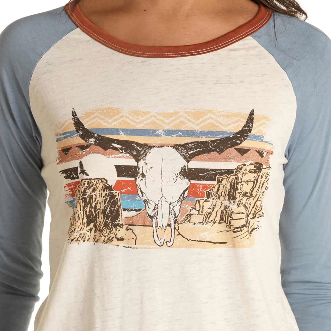 Rock & Roll Cowgirl Women’s Steer Skull Baseball T-shirt