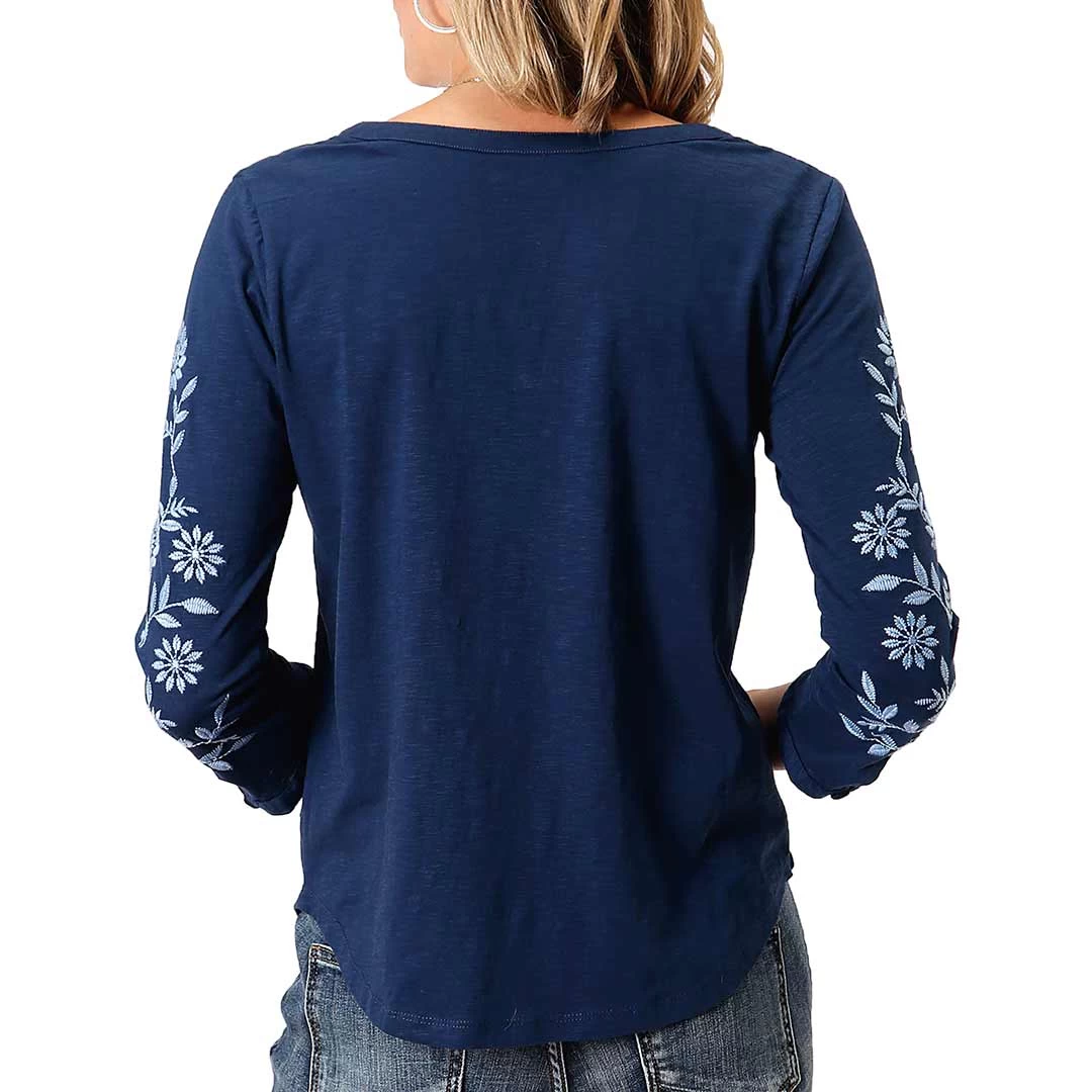 Worn alone or under a jacket or vest, dress up your favourite denim with this 3/4 sleeve top from Roper. This t-shirt features floral embroidered detail on the sleeves as well as a split V-neck and curved hem.