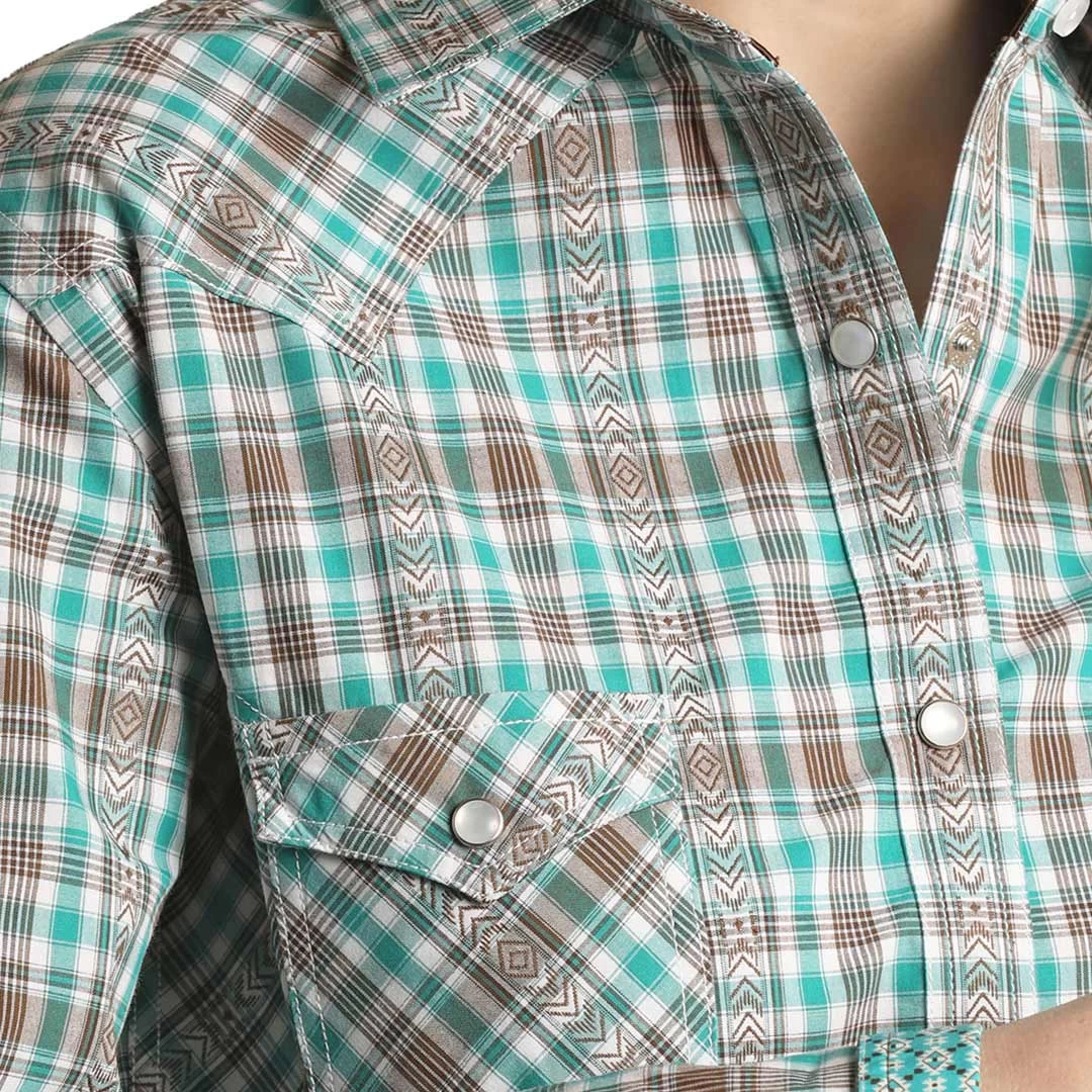 From Panhandle’s Rough Stock collection, this plaid shirt features an arrow detail in the plaid and contrast fabric on the under cuffs.