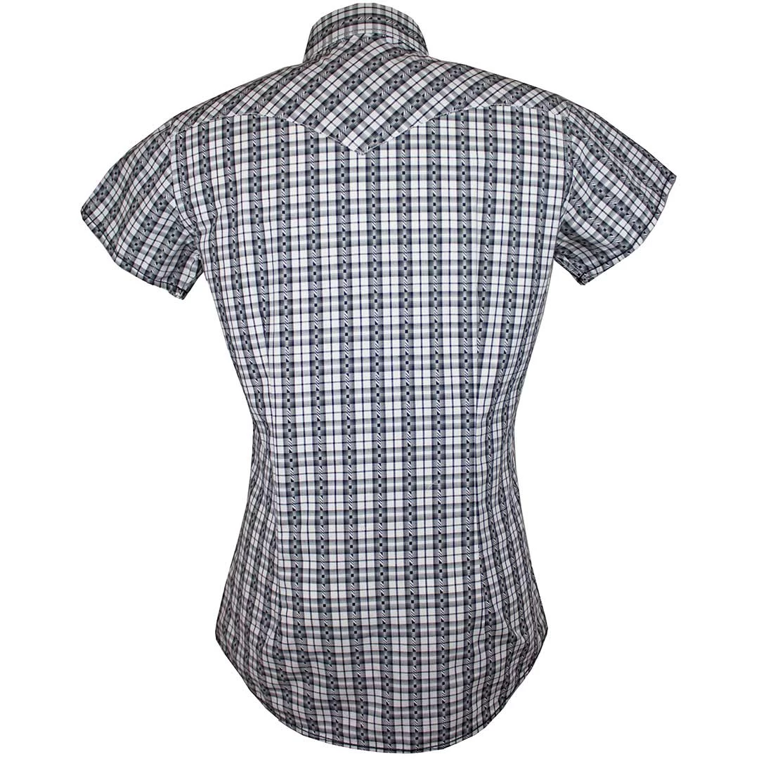 From Panhandle’s Rough Stock collection, this black and white plaid short sleeve shirt features an Aztec pattern in the plaid, two snap flap pockets and contrast fabric on cuff underside.