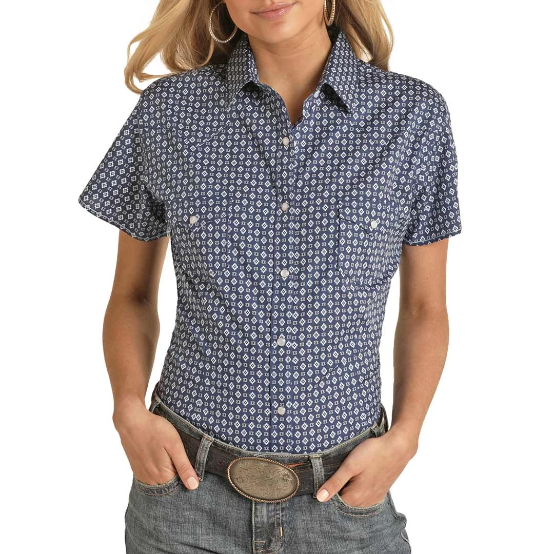 From Rough Stock by Panhandle, this women’s snap shirt is done in a navy and white diamond print. It has short sleeves, pearl snaps and two snap flap pockets.