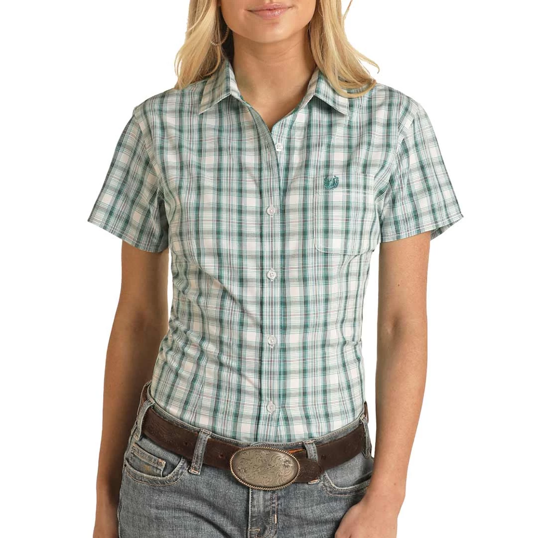 From Rough Stock by Panhandle, this women’s button-down shirt is done in a turquoise and white plaid print. It has short sleeves, pearl buttons and a single open pocket with logo embroidery.