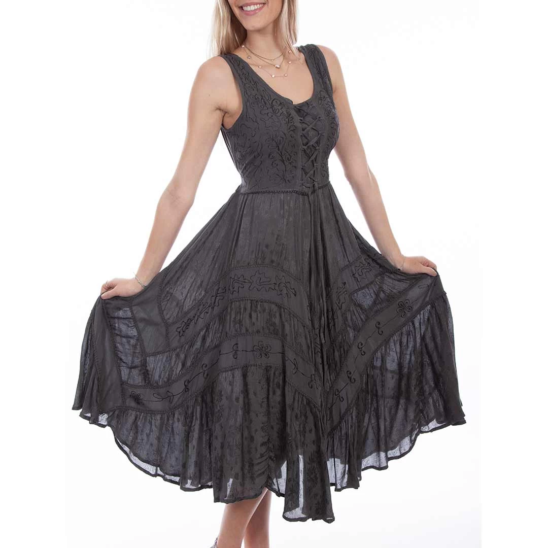 Celebrate the season with this tiered sleeveless dress from Scully featuring a scoop neck with a lace up bodice, scrolling fabric throughout and a paneled tiered skirt. Worn alone or with your favourite cover and boots, this will have you feeling stylish and comfortable.