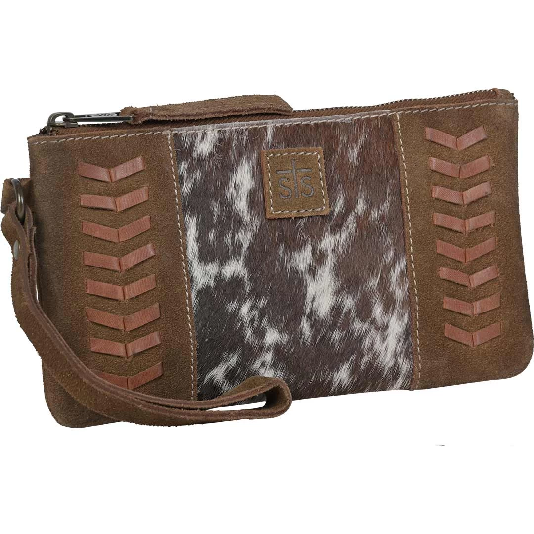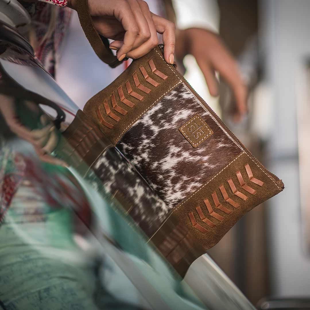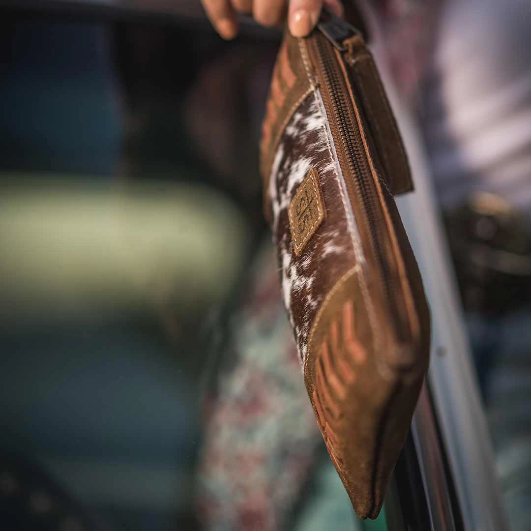 Add some western flair to your getup with our Cowhide Saddle Tramp Wristlet.