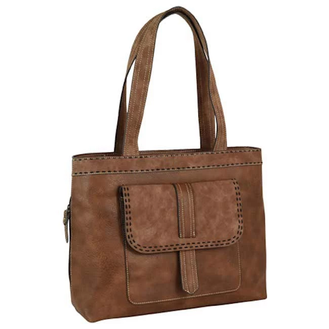 This Tony Lama tote bag is done in tonal brown leather with double stitched accents. Featuring one compartment, one slot pocket, four credit card slots, one side zipper pocket, one front exterior pocket with magnetic closure and a zipper top you will be able to keep all your essentials organized.