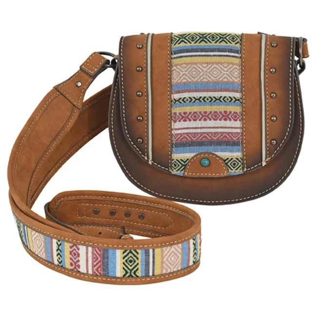 This chic women’s saddle bag from Tony Lama will add some western style to your wardrobe. It features a woven Southwestern print accent, metallic studs, one compartment, three card slots, exterior cell phone pocket, wide adjustable shoulder strap and a magnetic snap closure.