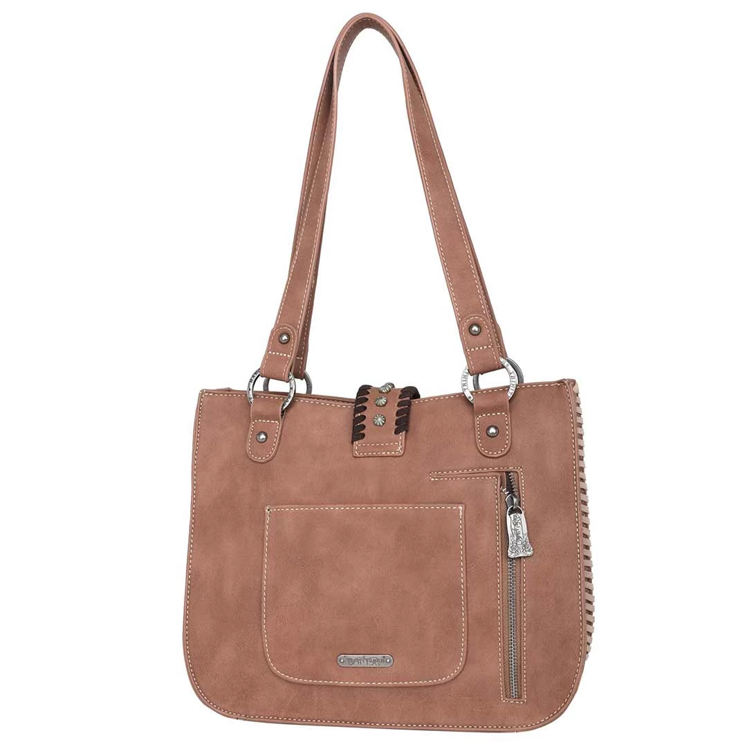 From the Trinity Ranch line by Montana West, this partial genuine leather hair-on hide and PU leather tote bag has genuine hair-on cowhide on the front pocket, antique silver turquoise concho on the flap with magnetic button closure, accented with antique silver and patina gold studs, whipstitch detail and a top zipper closure. Inside the single compartment is divided by a medium zippered pocket and includes a zippered pocket and 2 open pockets. There is a zippered pocket on the back as well as an open pocket and metal feet on the bottom for protection and stability.