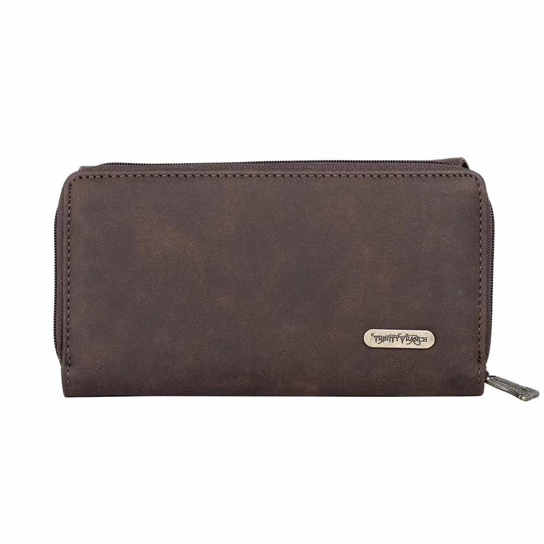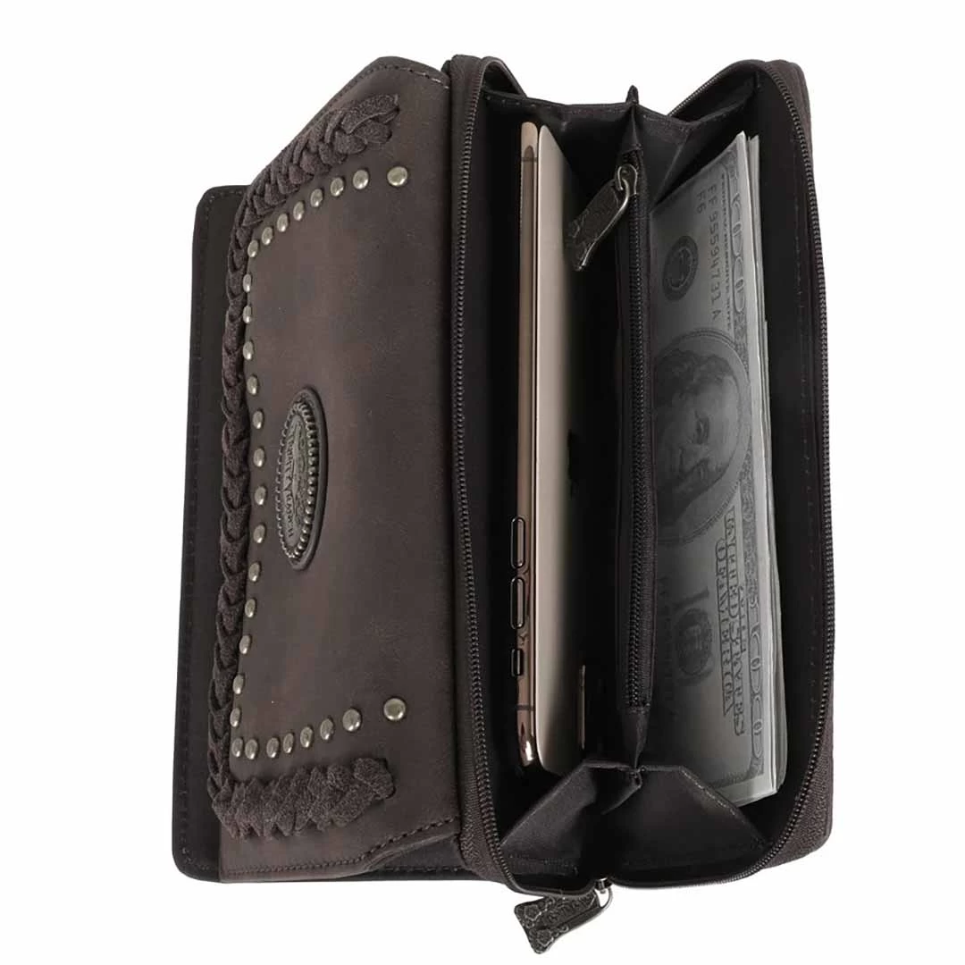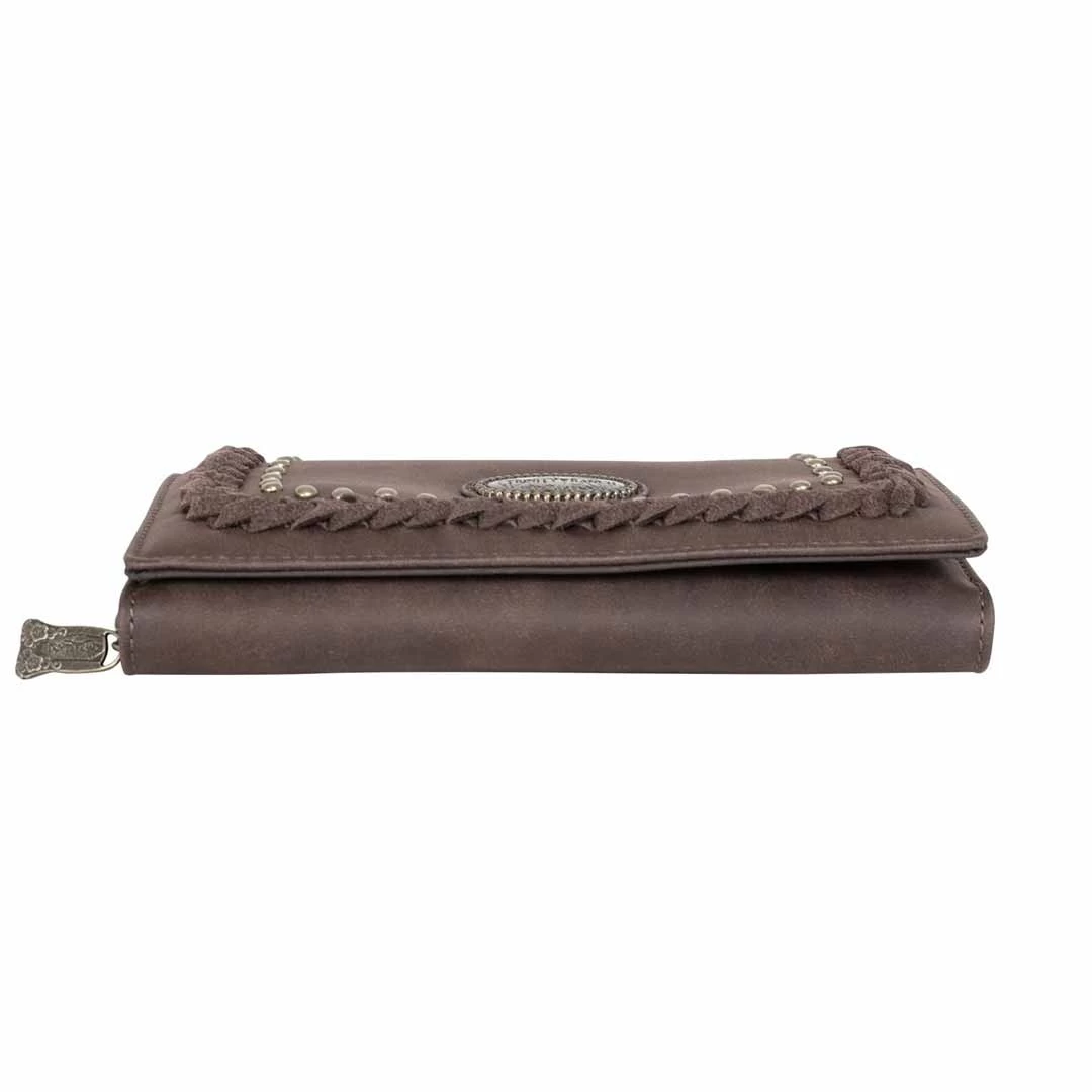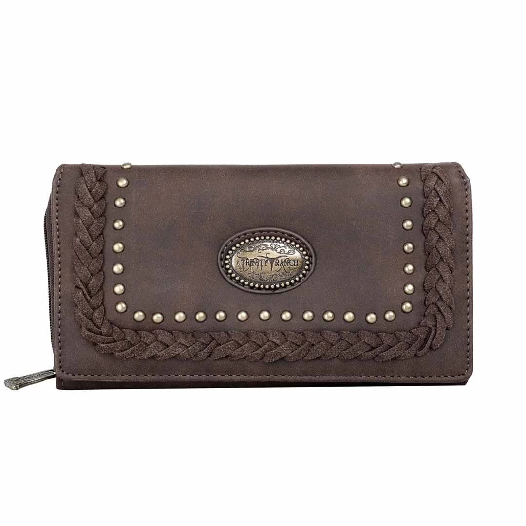 Made of partial leather, this western secretary wallet from Trinity Ranch has whipstitch detail accented with antique silver studs, button closure on the front, multiple card slots and 2 long slot compartments, zipper closure on the back with single compartment divided by a medium zippered pocket.