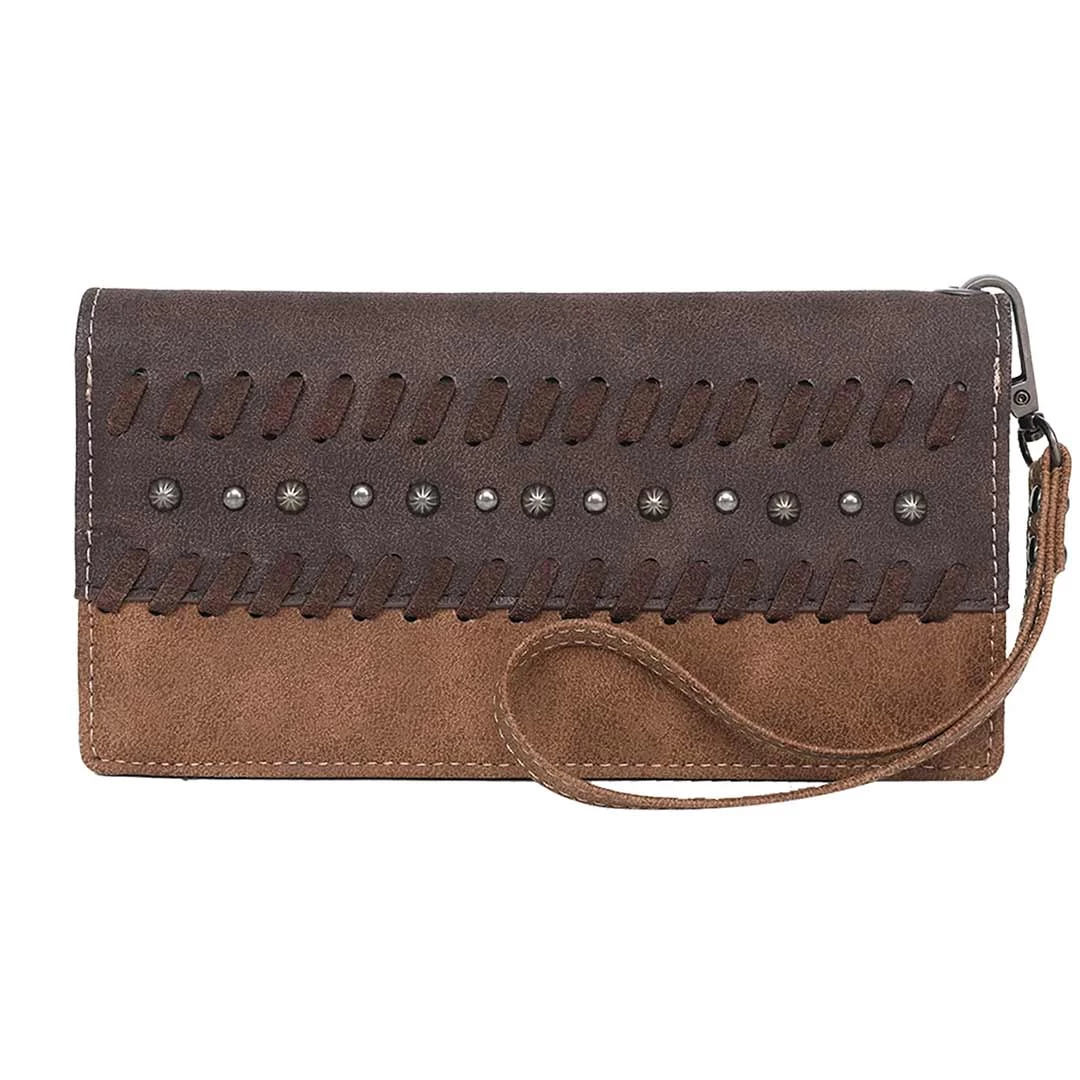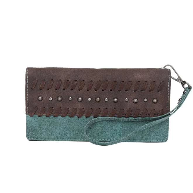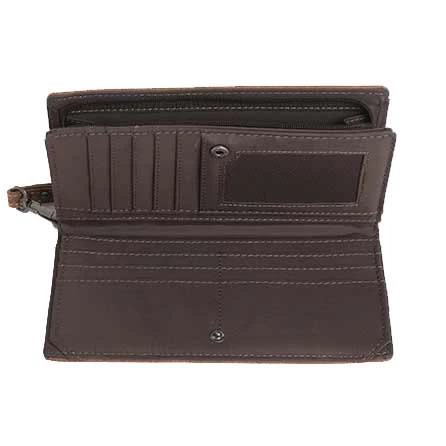 This Wrangler by Montana West wristlet wallet is made of PU leather and features whipstitch detail, accented with antique silver and studs and a button closure. Inside of the wallet has 9 card slots and 1 ID holder, zipper closure on the back with dual compartment, single removable strap to convert the wallet into a wristlet and an antique silver Wrangler rope logo.