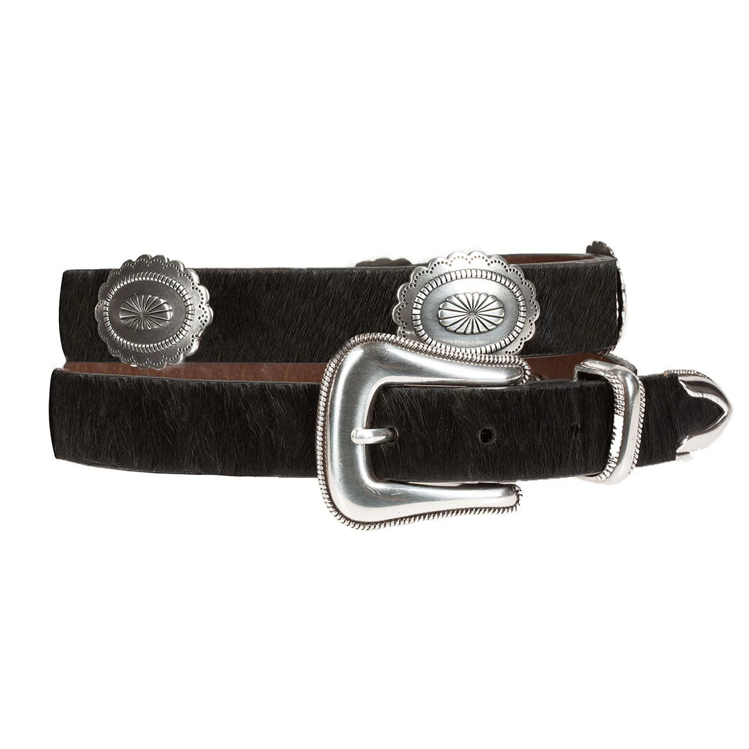From Spirit Leather Works Wrangler collection, this hair on hide with full grain leather belt features conchos and a 3 piece silver buckle.