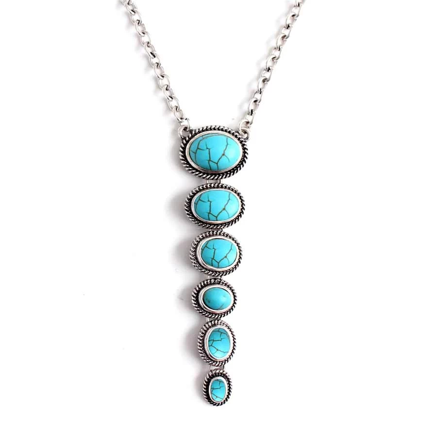 From Wyo-Horse, this necklace features beautiful turquoise or turquoise, natural and red stones dangling from a delicate chain in increasingly smaller sizes.