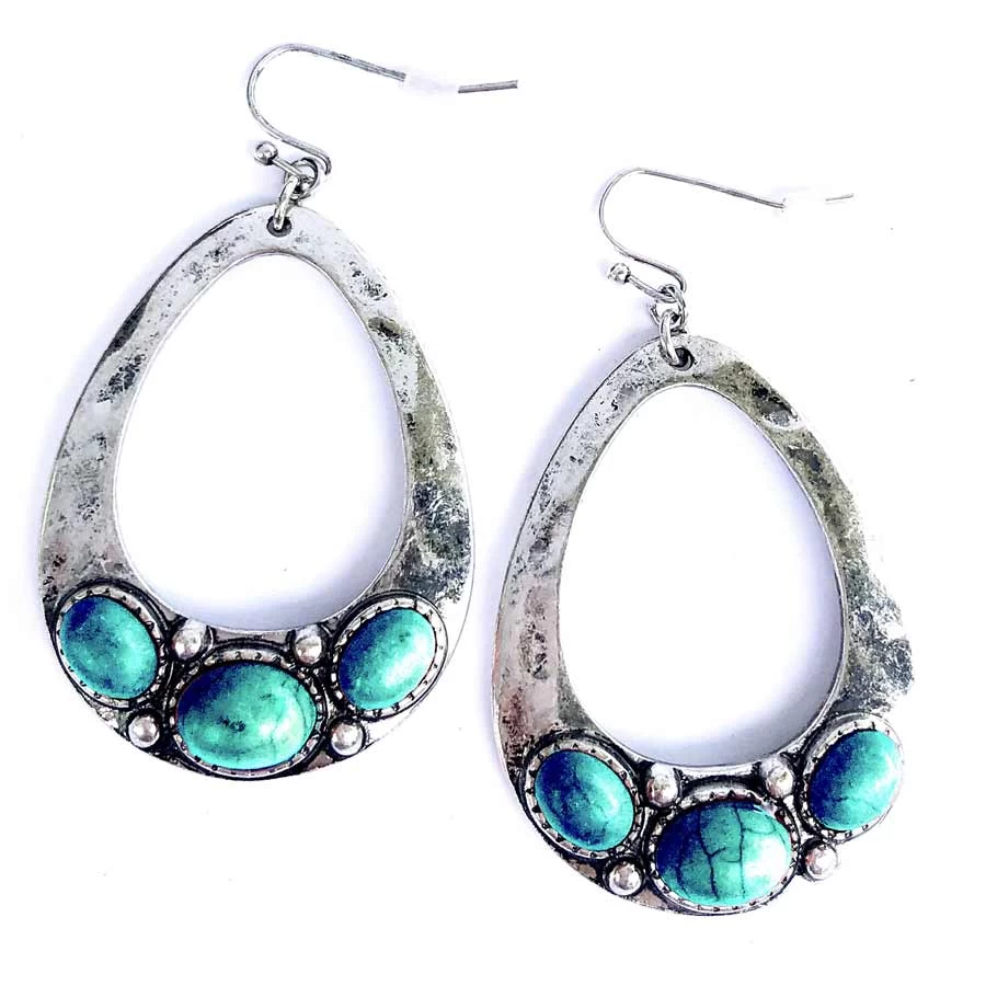 From Wyo-Horse, these earrings are a perfect statement piece that reflects an artistic nature with southwestern style and will pair perfect with your favorite denim. The earrings feature a teardrop hoop with 3 stones at the bottom.